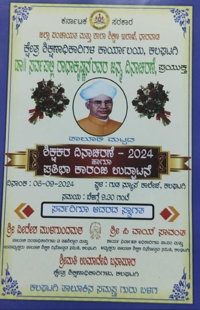 ಧಾರವಾಡ ಜಿಲ್ಲೆಯ ಕಲಘಟಗಿ ಪಟ್ಟಣದಲ್ಲಿ ಶಿಕ್ಷಣ ಇಲಾಖೆ ವತಿಯಿಂದ ಆಯೋಜಿಸಲಾಗಿರುವ ಶಿಕ್ಷಕರ ದಿನಾಚರಣೆಯ ಆಮಂತ್ರಣ ಪತ್ರಿಕೆಯಲ್ಲಿ ಕ್ಷೇತ್ರದ ಶಾಸಕರು, ಜಿಲ್ಲಾ ಉಸ್ತುವಾರಿ ಸಚಿವರಾದ ಸಂತೋಷ ಲಾಡ್ ಅವರ ಹೆಸರು ಕೈಬಿಟ್ಟಿರುವುದು ಚರ್ಚೆಗೆ ಗ್ರಾಸವಾಗಿದೆ.