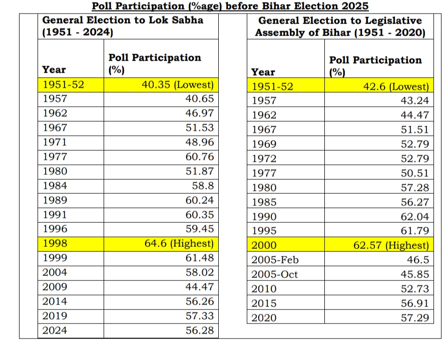 ಚುನಾವಣಾ ಆಯೋಗ, ವಿಧಾನಸಭಾ ಚುನಾವಣೆಯ ಮೊದಲ ಹಂತವು, ಬಿಹಾರದ ಇತಿಹಾಸದಲ್ಲಿ ಇದುವರೆಗಿನ ಅಧಿಕ ಎಂದಿದೆ. ಶೇಕಡಾ 64.66ರಷ್ಟು ಮತದಾನದೊಂದಿಗೆ ಹಬ್ಬದ ಮನಸ್ಥಿತಿಯಲ್ಲಿ, ಶಾಂತಿಯುತವಾಗಿ ಮುಕ್ತಾಯಗೊಂಡಿತು ಎಂದು ಹೇಳಿದೆ.