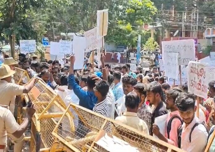 100ಕ್ಕೂ ಹೆಚ್ಚು ಸ್ನಾತಕೋತ್ತರ ಪದವೀಧರ ವಿದ್ಯಾರ್ಥಿಗಳು, ತುಮಕೂರು ವಿವಿ ಆವರಣದಿಂದ ಜಿಲ್ಲಾಧಿಕಾರಿ ಕಚೇರಿವರೆಗೆ ಪ್ರತಿಭಟನ ಮೆರವಣಿಗೆ ನಡೆಸಿದ್ದು, ಮಾರ್ಗ ಮಧ್ಯೆ ಬಿಜಿಎಸ್ ವೃತ್ತದಲ್ಲಿ ಮಾನವ ಸರಪಳಿ ನಿರ್ಮಿಸಿ ಪ್ರತಿಭಟನೆ ಮಾಡಿದರು..