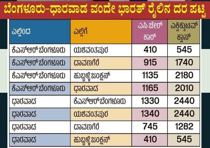 ಇನ್ನೂ ಧಾರವಾಡದಿಂದ ಪ್ರಯಾಣಿಸುವ ರೈಲಿಗೆ ಧಾರವಾಡದಿಂದ ಬೆಂಗಳೂರು 1340, 2440 ನಿಗದಿ ಮಾಡಲಾಗಿದೆ. ಧಾರವಾಡದಿಂದ ಯಶವಂತಪುರ 1340, 2440 ರೂಪಾಯಿ ನಿಗದಿ ಮಾಡಲಾಗಿದೆ. ಧಾರವಾಡ-ದಾವಣಗೆರೆ 745, 1282 ರೂಪಾಯಿ ಹಾಗೂ ಧಾರವಾಡದಿಂದ ಹುಬ್ಬಳ್ಳಿಗೆ 410,545 ರೂಪಾಯಿ ನಿಗದಿ ಮಾಡಿ ರೈಲ್ವೇ ಇಲಾಖೆ ದರಪಟ್ಟಿ ಬಿಡುಗಡೆ ಮಾಡಿದೆ.