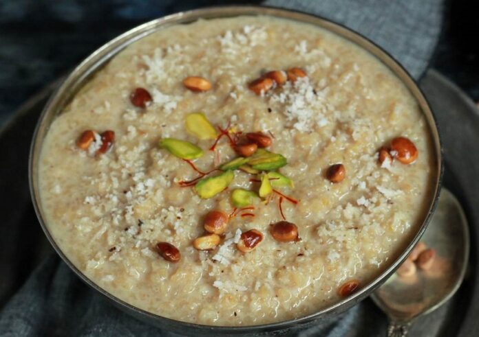 ಬೇಕಾಗುವ ಸಾಮಗ್ರಿ: ಒಂದು ಕಪ್ ಗೋಧಿಕಡಿ, ಒಂದು ಕಪ್ ತುರಿದ ಕೊಬ್ಬರಿ, ಅರ್ಧ ಕಪ್ ಬೆಲ್ಲ, ಸಿಹಿ ನಿಮಗೆ ಬೇಕಾದಷ್ಟು ಹಾಕಿ, ಕೊಂಚ ಉಪ್ಪು, ಗೇರುಬೀಜ, ಒಣದ್ರಾಕ್ಷಿ, ಏಲಕ್ಕಿ ಪುಡಿ, ಅರ್ಧ ಕಪ್ ತುಪ್ಪ.