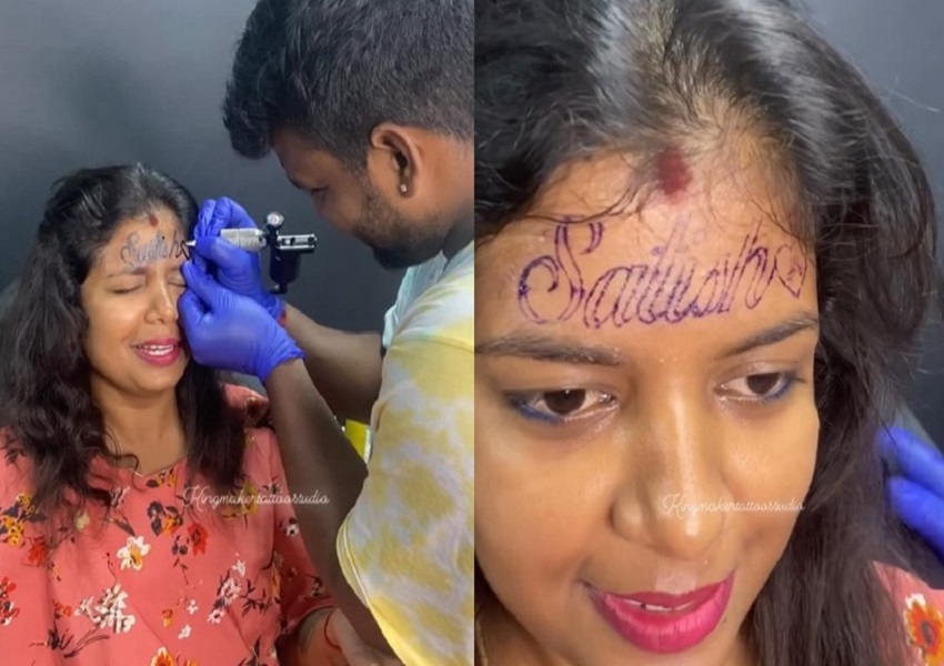 ಹೌದು, ಸತೀಶ್ ಎಂಬ ಪ್ರಿಯಕರನ ಪ್ರಿಯತಮೆ ಈ ರೀತಿ ಹಣೆಯ ಮೇಲೆ ಟ್ಯಾಟೂ ಹಾಕಿಸಿಕೊಂಡಿದ್ದು, ಕಿಂಗ್ ಮೇಕರ್ ಟ್ಯಾಟೂ ಸ್ಟುಡಿಯೋದ ಇನ್ಸ್ಟಾಗ್ರಾಮ್ ಅಕೌಂಟ್ನಲ್ಲಿ ಈ ವೀಡಿಯೋ ಶೇರ್ ಮಾಡಲಾಗಿದೆ. ಈಕೆ ತನ್ನ ಹಣೆಯ ಮೇಲೆ ಸತೀಶ್ ಎಂಬ ಹೆಸರಿನ ಹಚ್ಚೆ ಹಾಕಿಸಿಕೊಂಡಿರುವ ವೀಡಿಯೋ ಇದಾಗಿದ್ದು, ತರಹೇವಾರಿ ಕಾಮೆಂಟ್ಸ್ ಬಂದಿದೆ.