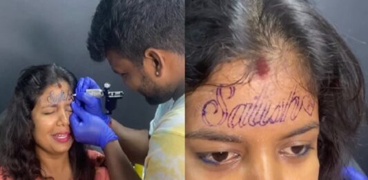 ಪತಿಯ ಹೆಸರನ್ನು ಹಣೆಯ ಮೇಲೆ ಟ್ಯಾಟೂ ಹಾಕಿಸಿಕೊಂಡ ನಾರಿ..